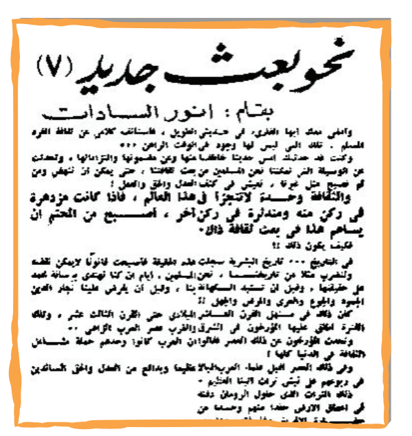 ولا يقدم السادات هذا الرأى باعتباره اقتراحًا قابلًا للدراسة والتمحيص، بل هو حقيقة وأُمنية يتحتم الاعتراف بها ما دمنا نحن- المسلمين- نريد أن تفتح الأبواب أمام البعث الجديد، وإذا لم نؤمن بهذه الحقيقة فلا سبيل على الإطلاق إلى النهوض بشعوب العالم الإسلامى لأنه من المحال جعل البعث الجديد أمرًا واقعًا فى بلادنا المتأخرة الجاهلة المريضة الجائعة إذا لم نعمل فورًا على إزاحة الغشاوة عن عيون الملايين المسلمة، لكى ترى الطريق، ومن هنا تبدأ ثقافة الفرد المسلم تأخذ شكلها الجديد فى هذا القرن العشرين الملىء بالنور، الملىء بالمدنية المشحون بالمعرفة.