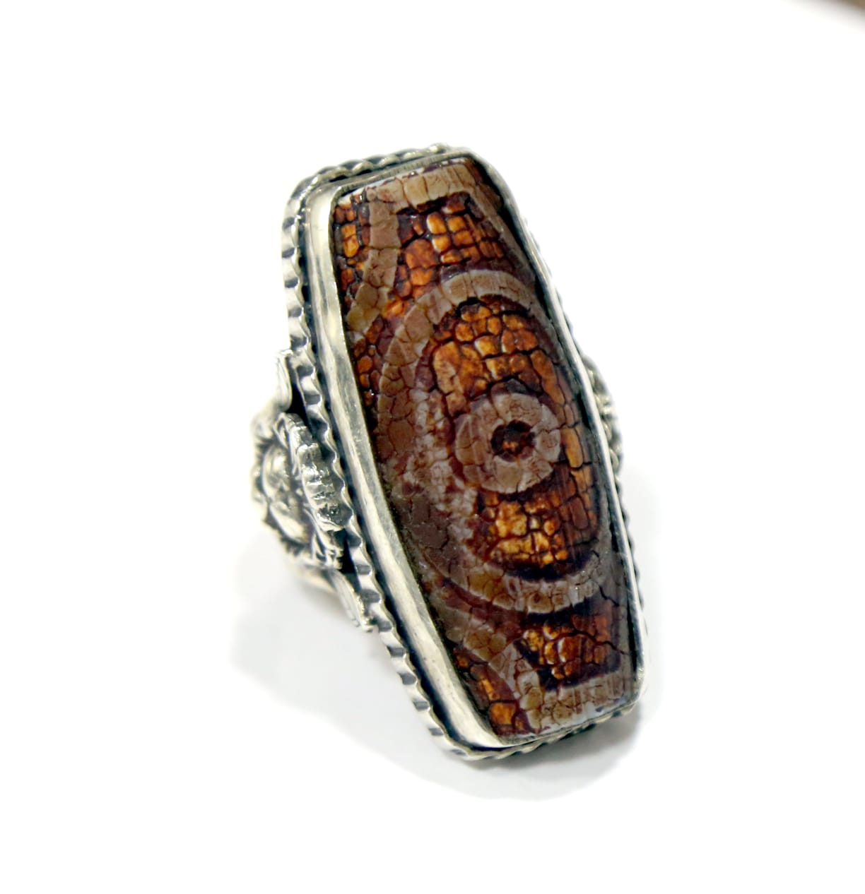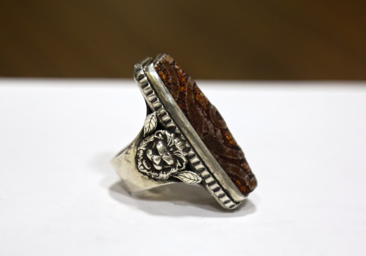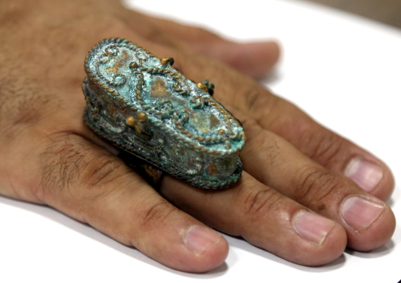 ويشير إلى الخواتم ذات البعد الحضارى، مثل تلك التى تحمل رموز حضارة بلاد الرافدين «عشتار وعشتروش»، والمطعّمة بقطع من الغابات المتحجرة، ما يعكس تواصلًا ثقافيًا وفنيًا بين الحضارات القديمة.