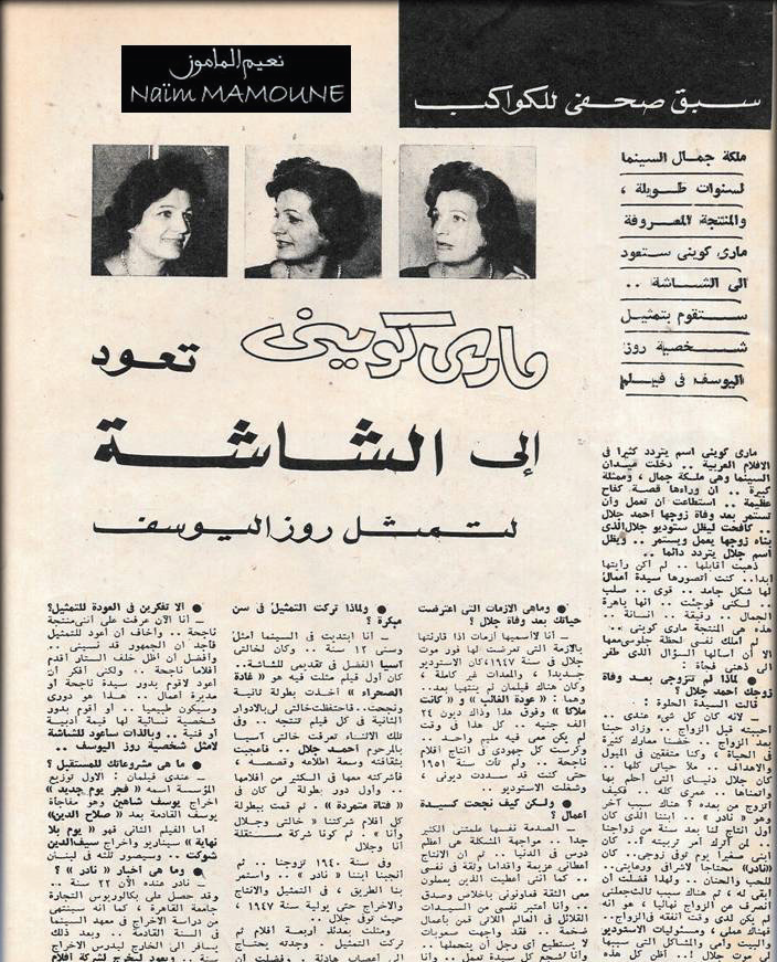 كان هذا التصريح من الأهمية التى جعلت مجلة «الكواكب» تحتفى به وتضعه تحت عنوان كبير «سبق صحفى»، وقيمة التصريح أولًا لكونه نبوءة لعمل فنى ضخم عن قصة حياة سيدة عظيمة، وهى السيدة فاطمة اليوسف، وثانيًا لأن صاحبة التصريح الانفراد كانت مارى كوينى بعد سنوات طويلة من غيابها الإعلامى واعتزالها التمثيل وتفرغها التام للإنتاجات الضخمة التى عرفت باسمها هى وخالتها آسيا داغر، وآخرها فيلم «صلاح الدين الأيوبى» الذى عُرض قبل شهور من إجرائها هذا الحوار فى عدد «الكواكب» بتاريخ ١٥ أكتوبر ١٩٦٣.