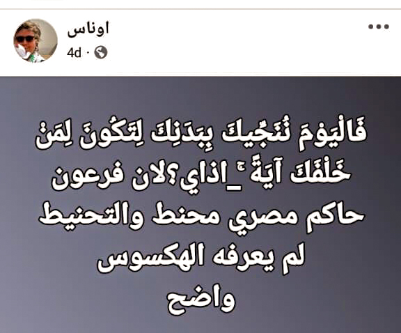 «أوناس» هو اسم الصفحة التى دشنتها د. إيناس الشافعى أستاذة اللغة المصرية القديمة بإحدى الجامعات المصرية الحكومية، ومن خلالها تشن هجومًا حادًا ضد شخص الملك المصرى رمسيس الثانى متهمة إياه بأنه فرعون الذى التقط موسى رضيعًا- فرعون الالتقاط والتنشئة- وأن ابنه الملك مرنبتاح هو فرعون الخروج. وعلى نفس الصفحة تتهم د. إيناس المصريين القدماء بالانقلاب على ما تسميه أسفار التوحيد التى سبقت الطوفان وأنهم استبدلوها بأسفار شيطانية وثنية على حد وصفها.