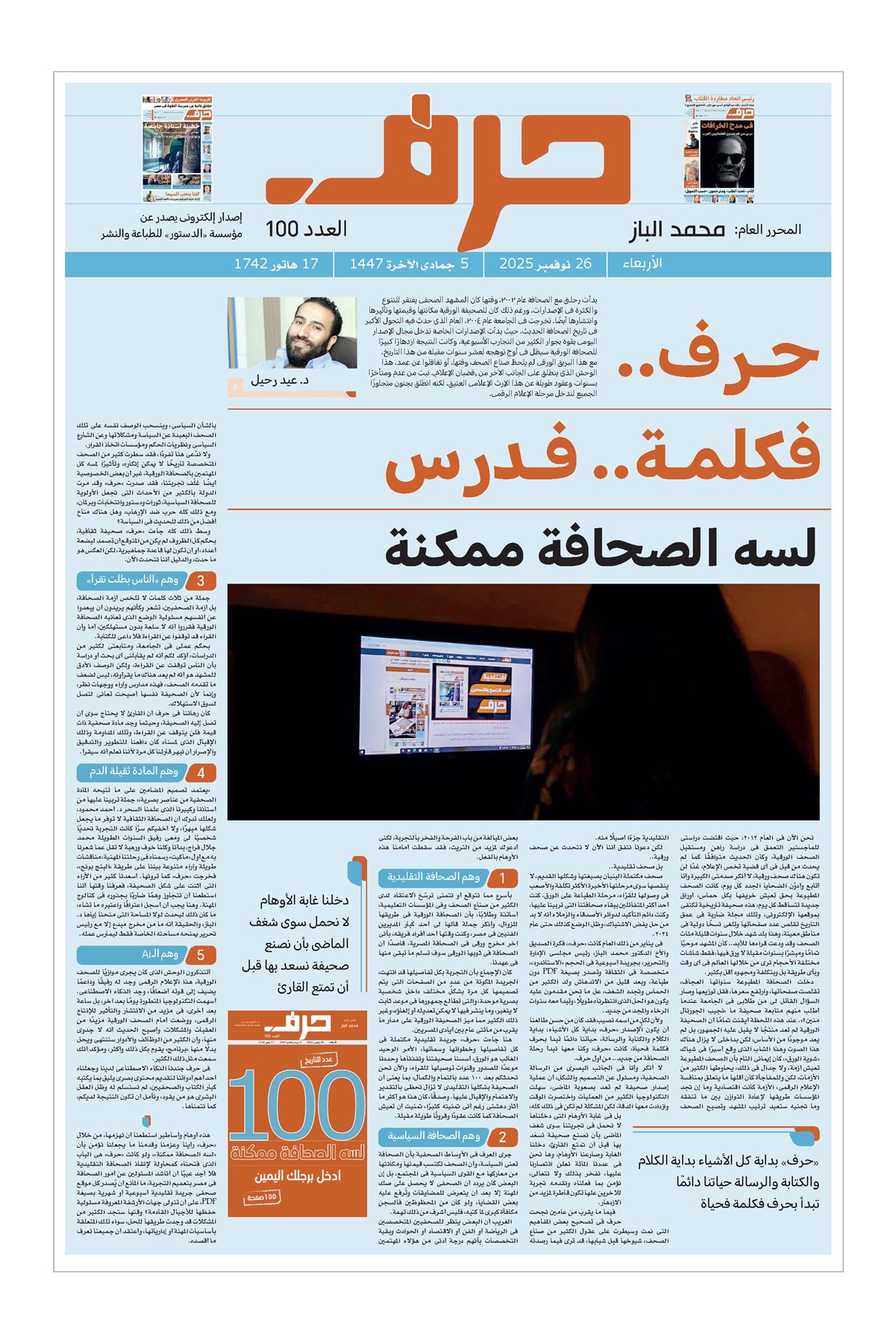 هذه أوهام وأساطير استطعنا أن نهزمها، من خلال «حرف» رأينا وعزمنا وقدمنا ما يجعلنا نؤمن بأن «لسه الصحافة ممكنة»، ولو كانت «حرف» هى الباب الذى فتحناه كمحاولة لإنقاذ الصحافة التقليدية فلا أجد عيبًا أن أناشد المسئولين عن أمور الصحافة فى مصر بتعميم التجربة، ما المانع أن يُصدر كل موقع صحفى جريدة تقليدية أسبوعية أو شهرية بصيغة PDF، على أن تتولى جهات الأرشفة المعروفة مسئولية حفظها للأجيال القادمة؟ وقتها ستجد الكثير من المشكلات قد وجدت طريقها للحل، سواء تلك المتعلقة بأساسيات المهنة أو إدارياتها، وأعتقد أن جميعنا نعرف ما أقصده.