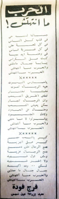 وأكتفى بذلك الاقتباس، حيث إن القصيدة ليست على المستوى الذى نضج به عفيفى مطر فيما بعد، وفى عقد الستينيات، ولا تستطيع تلك السطور القليلة أن تحصر تلك النصوص التى انطوت عليها المجلات أو الصحف، لأن هناك مفاجآت مذهلة فى ذلك المجال، وأولى المفاجآت أن المفكر والباحث الكبير دكتور فرج فودة كان يقرض الشعر منذ الستينيات، وبالفعل نشر قصائد فى مجلة الشعر، لكن المفاجأة تتوالى، فبعد رحيل جمال عبدالناصر فى ٢٨ سبتمبر ١٩٧٠، كتب قصيدة ساخنة، ونشرتها له جريدة الجمهورية فى بريد القراء فى ٥ أكتوبر عام ١٩٧٠، والقصيدة جاءت تحت عنوان «الحرب ما انتهتش»، جاء فيها:
