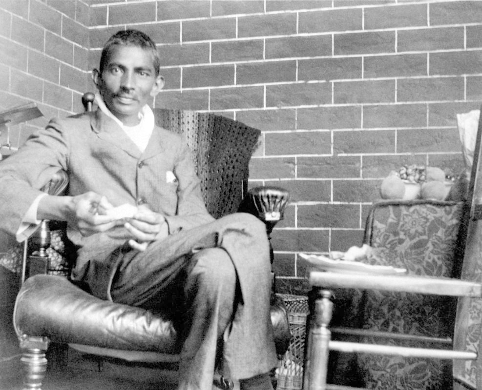 وكان غاندى عارى الرأس كعادته، كما أن صدره وظهره كانا عاريين أيضًا، ولم يستر من جسمه سوى الجزء الأسفل منه بمئزر مصنوع من القطن الهندى يصل حتى ركبته، ولم يلبس فى رجليه سوى خفين من الجلد، صنُعا بشكل «سندال» من الجهة الأمامية فقط، أما من الجهة الخلفية فكانا بدون «حاجز» (رفرف) فكانا أقرب إلى الشبشب العادى منهما إلى السندال.