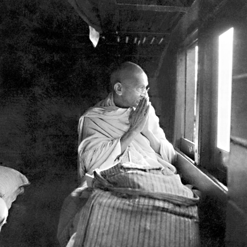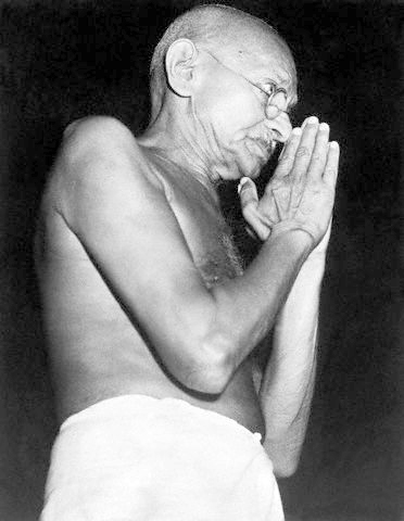 ويحيى غاندى زائريه من غير الهنود بمصافحتهم، أما الهنود فيحييهم ويحيونه على الطريقة الهندية القديمة، وذلك بأن يضم كل منهم راحتى كفيه الواحدة إلى الأخرى ويرفعها أمام وجهه، فيرد له الآخر التحية بالطريقة عينها، وقد كان بعض أنصار غاندى يغالون فى هذه التحية، فيضم الواحد منهم راحتى كفيه وينحنى إلى الأرض بين قدمى الزعيم، ثم ينهض تدريجيًا وهو يرفع يديه إلى أن تصلا إلى وجهه.