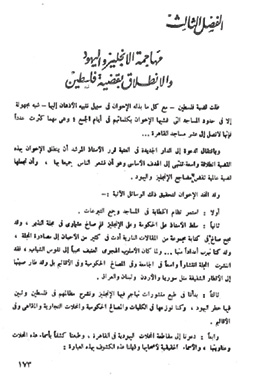 يقول: لا يختلف اثنان ولا تتناطح عنزتان على أن المشكلة السياسية هى لب المشاكل، وأن قضية إسرائيل تقع منها فى موقع القلب، ولعل موقف الإخوان منها واضح، فحربنا معهم حرب دينية وهم يسعون إلى الانتقام من هزيمة بنى قريظة، وقد اعترف الأخ مراد بخطئه عندما زار الدولة المزعومة، وفسّر موقفه بأنها من ديار الإسلام، وأعلن بملء فمه رفض السلام، كما أن الأخ شكرى بعد أن وافق على اتفاقية معسكر داود، أعلن موقفه المحمود، بسحب التأييد والإدانة والتنديد، وبقى الإخوان على رأيهم ثابتين وبعدائهم متمسكين.