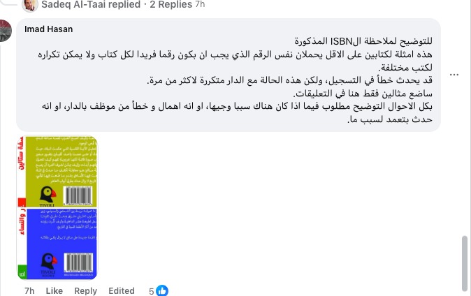 وأكملت: «ما يقوله السيد صادق الطائى عن الأرقام العالمية للكتب ISBN أنها مزيفة، فهو محض هراء، كل الكتب مأخوذة بأرقامها، وليس لدينا أى رقم لم نشتره أو زيفناه». وزادت: «ما أقوم به الآن مع بعض من يساعدنى، لأن لا إلمام لى باللغات الأجنبية، فى حالة معرفة أنها كتب مزيفة، من دون شك سأقوم بإيقافها».