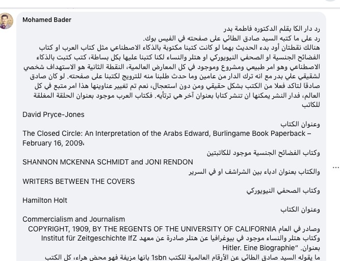 وتابع: «إذا كانت كتبًا حقيقية أتمنى من دار (ألكا) وضع أغلفة الكتب الأصلية، وعندها سأعتذر بشكل رسمى، وبالطريقة التى تراها الدار مناسبة لرد الاعتبار لها. أما إذا لم يتم ذلك فى غضون أيام، فأنا أطالب من هنا، من صفحة الصديق على بدر، بفتح تحقيق شفاف حول الكتب الوهمية التى تم تسويقها فى العراق على أنها مصادر حقيقية، وذلك لخطورة الأمر».