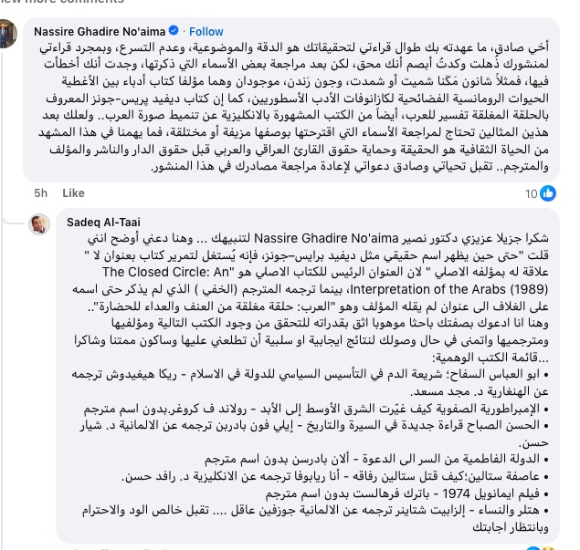وأضاف «الطائى»: «من العرف فى أخلاقيات النشر أن من حق الناشر تغيير العنوان لأسباب تجارية أو بلاغية بحسب ما يرتأيه المترجم والناشر. لكن يجب وضع عنوان الكتاب الأصلى، واسم المؤلف، ودار النشر الأصلية، ليتسنى للقارئ والباحث التأكد من مصداقية الكتاب»، قبل أن يعقب: «أستاذ على أشار أعلاه إلى بعض الكتب، وأنا هنا أطالبه بشكل رسمى، لأنه روج لكتب أخرى، أنا أشك أنها كتب وهمية لكتاب وهميين ومترجمين وهميين».