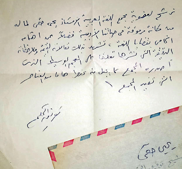 نرشح لعضوية مجمع اللغة العربية الأستاذ يحيى حقى لما له من مكانة مرموقة فى حياتنا الأدبية، فضلًا عن اهتمامه بقضايا اللغة.