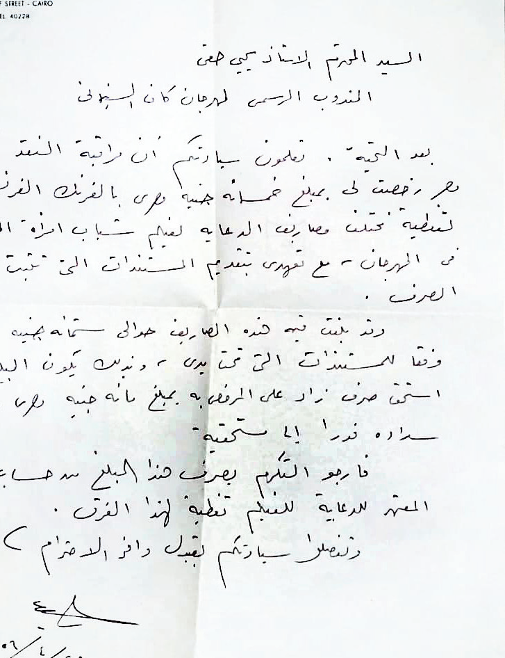 تعلمون سيادتكم أن مراقبة النقد فى مصر رخصت لى مبلغ خمسمائة جنيه مصرى بالفرنك الفرنسى لتغطية مختلف مصاريف الدعاية لفيلم «شباب امرأة» المعروض فى المهرجان، مع تعهدى بتقديم المستندات التى تثبت أوجه الصرف..