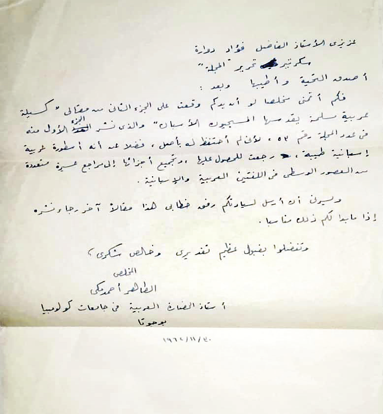 فكم أتمنى مخلصًا لو أن أيديكم وقعت على الجزء الثانى من مقالى كسيلة عربية مسلمة «يقدسها المسيحيون الإسبان» والذى نشر الجزء الأول منه فى عدد المجلة رقم ٥٣ لأنى لم أحتفظ له بأصل، فضلًا عن أنه أسطورة عربية إسبانية طيبة، رجعت للحصول عليها وتجميع أجزائها إلى مراجع عسيرة متعددة، من العصور الوسطى فى اللغتين العربية والإسبانية..