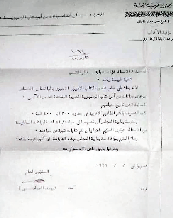 فإنه بناء على طلب نادى الكتاب الإفريقى الآسيوى الباكستانى بموافاته ببيانات أبرز كتاب الجمهورية العربية المتحدة تتضمن الآتى:
