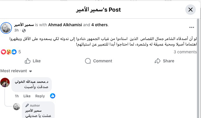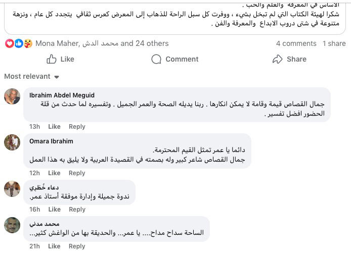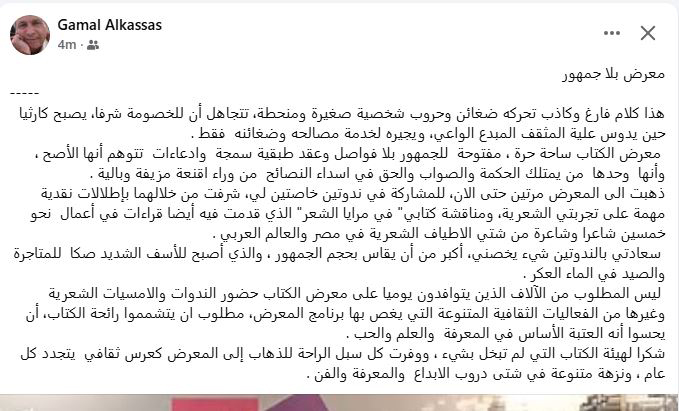 ولمن لم يتابع القصة من أولها، فقد بدأت فصول المهزلة المصرية من «البوست» المحذوف، والذى ذكرت محتواه فى الفقرة السابقة، تلاه فى اليوم الأول لندوات المعرض صورة لندوة الاحتفاء بالشاعر الكبير جمال القصاص تبدو فيها القاعة خالية من القليل من الجمهور من محبى جمال، ثم «بوست» آخر تجد صورة له بجوار هذا المقال، وجاء فيه ما نصه: «حين وصل الشاعر الكبير جمال القصاص إلى قاعة الشعر فى الموعد المحدد للقائه، وكنت معه، لم يجد أحدًا فى استقباله، المسئول عن برنامج الشعر لم يكلف نفسه عناء الحضور، فقط أربعة أو خمسة شباب مسئولين عن التنفيذ يجلسون فى خلفية القاعة».. «جلسنا معًا فى الصف الأول، ومعنا الشاعر محمد الكفراوى الذى سيدير اللقاء، وشاعرة زميلة من الغربية.. لم يشر لنا أحد بالبدء أو الانتظار، من خبراتى السابقة توسمت أن يحضر الجمهور حين تبدأ الندوة، فصعد للمنصة وبدأ الكلام، لكن لا يوجد أى تحرُّك لجذب الجمهور، فاستمرَّت الندوة كما بدأت، ساعة ونصف الساعة تقريبًا على ما هى عليه»، «لم يلتفت أحد لوضع الميكروفون على حامل أمام فمه، مراعاة لحالته الصحية، طول الوقت يمسك مايك لاسلكى لا يوصل صوته الواهن لى وأنا على بعد خطوتين، فكنت أنبهه كل دقيقتين.. وحين انتهت الندوة لم يتحدث أحد مع الأستاذ أيضًا، تركوه ومضوا بشكل لا يليق بتاريخه وأستاذيته»، «القصة ليست أن تضع اسم جمال القصاص فى ورقة، القصة هى أن تقيم احتفالًا لائقًا بقامة إبداعية وثقافية سامقة، لكنهم لا يعرفون مع الأسف!!».