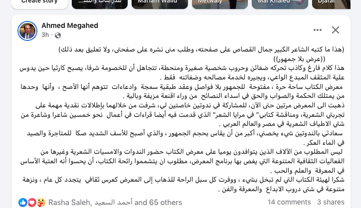 والحقيقة أننى لا أعرف كيف يمكن التعليق على مثل هذا المنشور، ولا فى أى سياق يمكن قراءته، فلا لغته تليق بكاتبته، ولا نصه يليق بوصف شعراء وكتاب كبار، ولا حتى متوسطى الموهبة، هى كتابة تصف نفسها، بما فيها من «تردى»، ومن تعميم لم أحب أن تنزلق إليه، حتى أننى تمنيت لو أننى لم أقرأه، ولم يمر أمام عينىَّ، وكم من كتابات لأصدقاء على الموقع الأزرق لا يرشحها لى، ولا أراها..