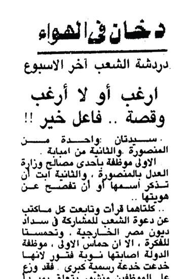 كلتاهما قرأت وتابعت كل ما كتب عن دعوة الشعب للمشاركة فى سداد ديون مصر الخارجية، وتحمستا للفكرة، إلا أن حماس الأولى، موظفة الدولة، أصابته نوبة فتور لأنها خُدعت خدعة رسمية كبرى، فقد وزع على الموظفين منشور يتعلق بمبدأ المشاركة فى سداد الديون أرفق به كشف بأسمائهم، ظاهر المنشور ديمقراطى.. فقد وزع على الجميع سؤالًا واحدًا: هل ترغب فى المشاركة أو لا ترغب؟ ولأنها لم تكن قد حددت بعـد قدر مشاركتها، عن طريق الحملة الشعبية، فقد سجلت أمام اسمها عدم رغبتها حاليًا، إلا أنها لـم تلبـث أن فوجئت بأن الخصم من المرتب قد شمل الجميع: الراغبين وغيــر الراغبين، وتسأل الموظفة: أين حرية الفرد فى اتخاذ القرار؟ وأين تصريحات المسئولين بإنكار تطبيق مبدأ الإجبار؟.. وأين؟ وأين؟