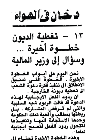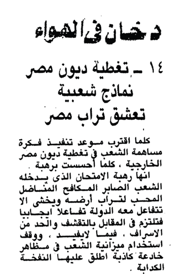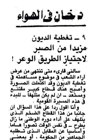ويقول: إننى فى انتظار تعليق اقتصادى على اقتراحى هذا، وفى نفس الوقت لا أملك إلا أن أعود أحيى الأستاذ جلال الدين الحمامصى على حملته، وإذا ما أنشئت «م. د. م» فلتحول المبالغ التى تتجمع لسداد الديون، لإقامة مشاريع إنتاجية تساعدنا على سداد مديونيتنا من ناحية، ومن ناحية أخرى تمنع عنا التضخم والغلاء ومد اليد «للى يسوى واللى ما يسواش».