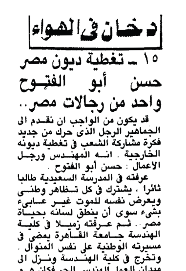 فى ٧ نوفمبر ١٩٨٥ وتحت عنوان «تغطية ديون مصر» يطلق جلال الدين الحمامصى صرخة أحد المواطنين: خذوا نصف مرتبى.. فلابد للتفاؤل أن ينتصر، ثم يقول: جاء إلى مكتبى ولم أكن موجودًا، فما كان منه إلا أن ألقى بمظروف طلب أن يُسلَّم إلىّ ثم انصرف.