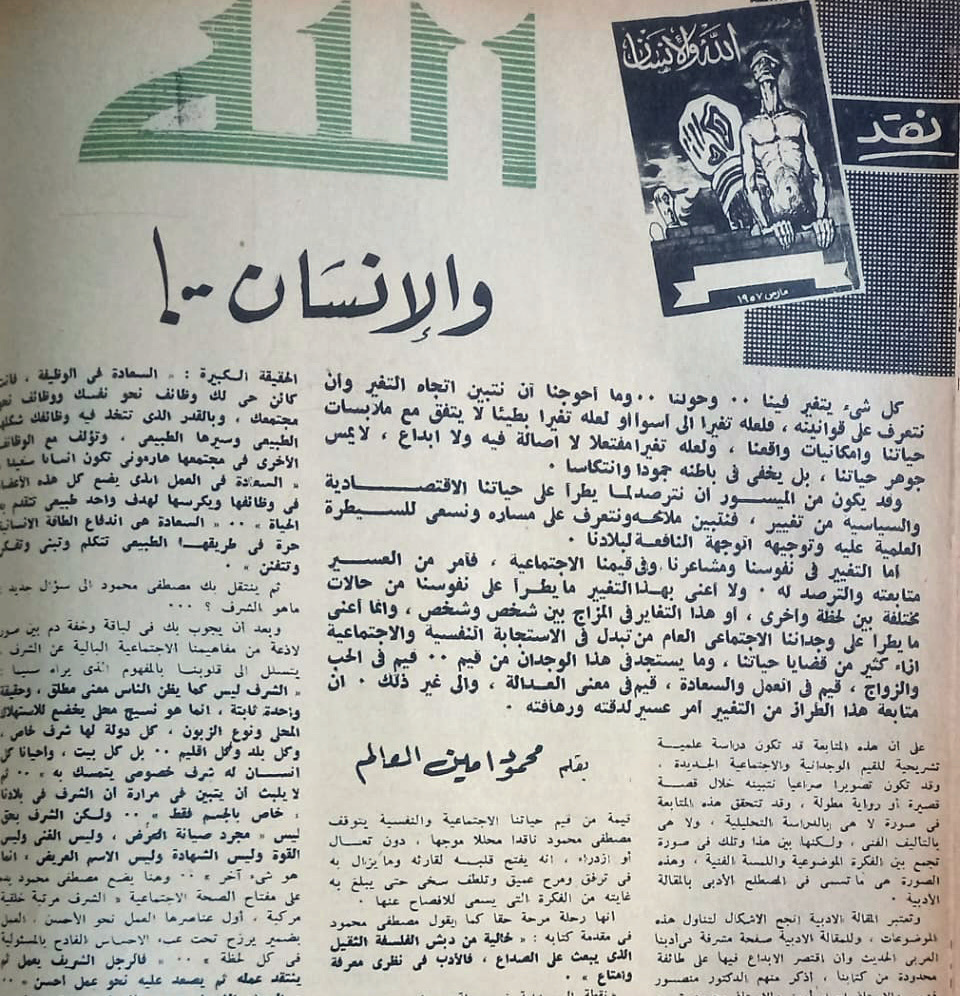 ثم راح يكتب مقالات ذات طابع تأملى عميق، يتشح بالأفكار الفلسفية، وكانت تلك المقالات التى راحت تتواتر فى بداياتها مجرد عروض لكتب مفكرين غربيين، ومن هنا تسللت تلك الأفكار التى راحت تؤثر يومًا بعد يوم على مصطفى محمود الفكرى والثقافى والقصصى بشكل خاص، ثم راح يكتب مقالات بشكل شبه منتظم، تعتمد على أفكار لمفكرين وكتّاب غربيين، دون أن تكون عروضًا أو مناقشة مستفيضة لكتبهم، وكانت تلك المقالات التأويلية، هى النواة التى أسست لكتاب «الله والإنسان» الذى صدر فى مارس ١٩٥٧ عن سلسلة «كتب للجميع» بدار الجمهورية، وتم الترحيب به على نطاق واسع كما سنوضح لاحقًا.