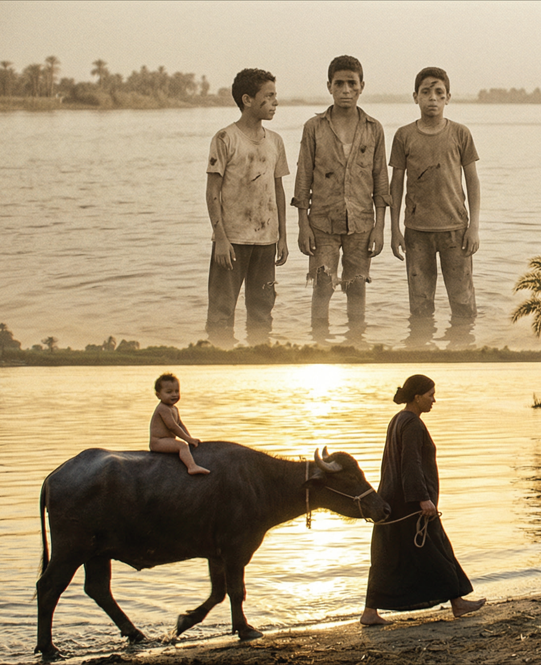 و«شكرية» تضع صغيرها العارى فوق ظهر الجاموسة، وتجرَّها بالحبل الطويل نحو النيل.