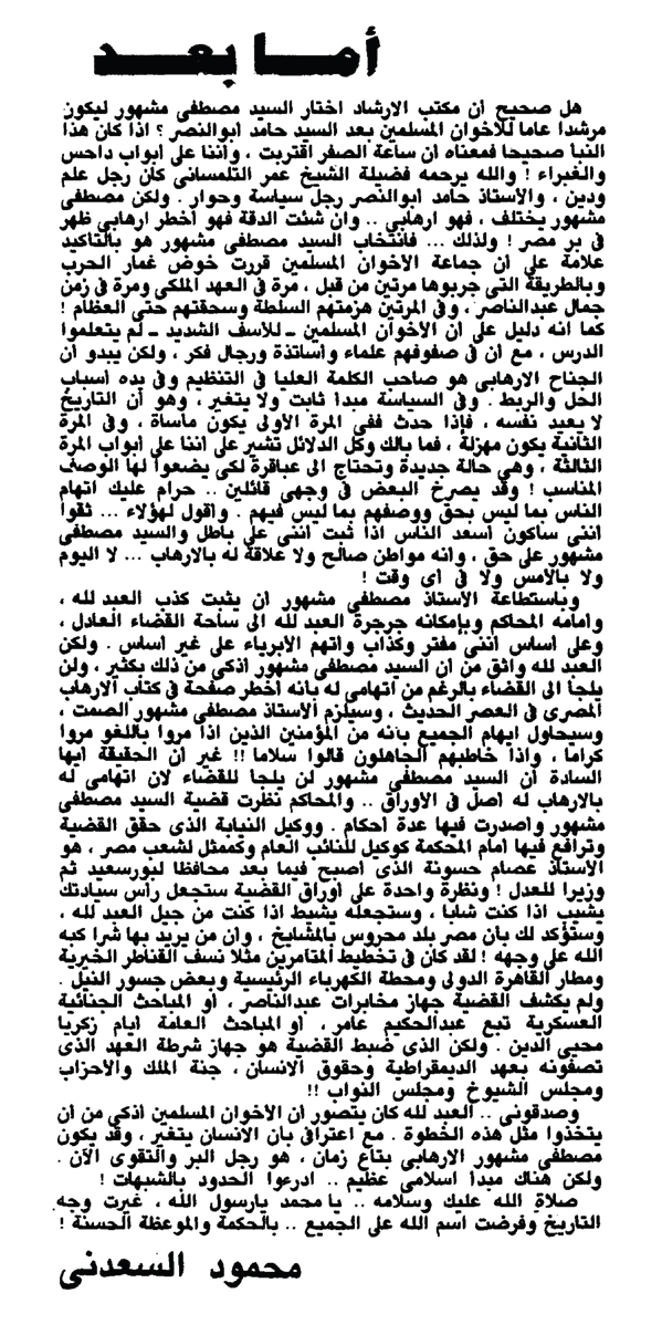 ومن بين ما لفت انتباهى وأنا أُقلّب فى أرشيف مصطفى مشهور الصحفى، مقال كتبه الكاتب الكبير محمود السعدنى، فى زاويته أما بعد، قال فيه نصًا:
