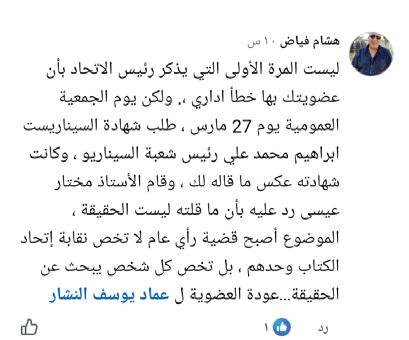 بينما قال الروائى هشام فياض: «ليست المرة الأولى التى يذكر رئيس الاتحاد بأن عضويتك بها خطأ إدارى»، معتبرًا أن «الموضوع أصبح قضية رأى عام، لا تخص نقابة اتحاد الكتاب وحدهم، بل تخص كل شخص يبحث عن الحقيقة... عودة العضوية لعماد يوسف النشار».