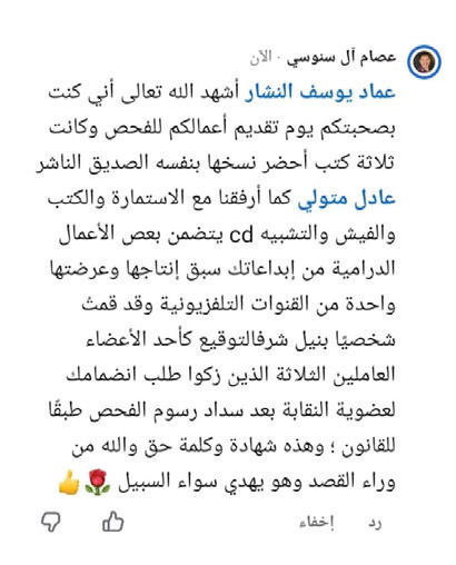 ولحق به الناقد والناشر عادل متولى قائلًا: «إزى بعد تسليم النسخ المطلوبة، والفحص والموافقة والحصول على العضوية، يرجعوا فى كلامهم؟!»، قبل أن يجيب: «الأمر واضح جدًا أن هناك غرضًا، وهو حرمانه (النشار) من العضوية».