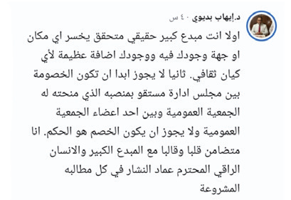 كما علق الأديب الدكتور إيهاب بديوى على الأزمة، موجهًا حديثه إلى عماد النشار: «أنت مبدع كبير حقيقى، ووجودك إضافة عظيمة لأى كيان ثقافى. ولا يجوز أبدًا أن تكون الخصومة بين مجلس إدارة مستند على منصبه الذى منحته له الجمعية العمومية، وبين أحد أعضاء الجمعية العمومية، ولا يجوز أن يكون الخصم هو الحكم. أنا متضامن قلبًا وقالبًا مع المبدع الكبير والإنسان الراقى المحترم عماد النشار فى كل مطالبه المشروعة».