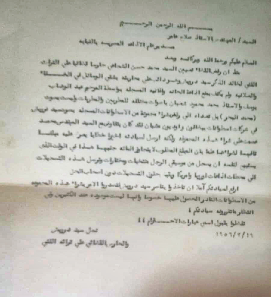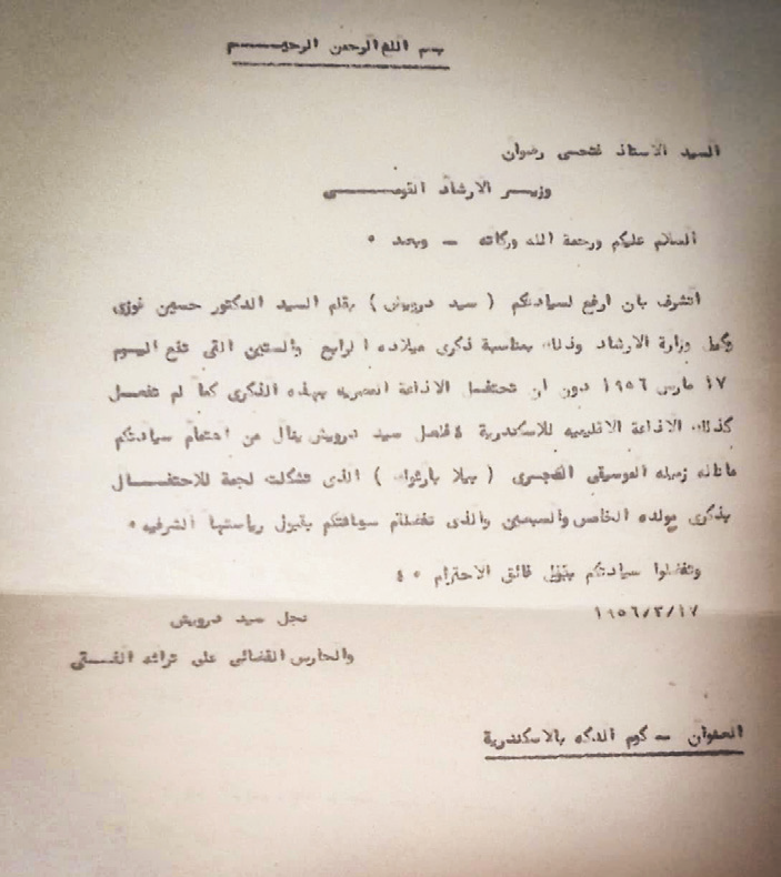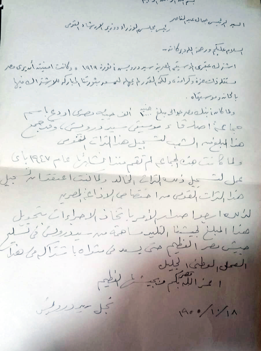 وعثرت على الخطاب الذى كتبه بخط يده ابن سيد درويش للرئيس جمال عبدالناصر، وهذا نصه: